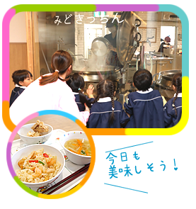 ピカピカの清潔感溢れる給食室で毎日おいしい手作り給食を調理しています。 「今日のお給食は何かな~?」 子どもたちは給食室の大きなガラス窓に張り付き、大きな大きな調理釜のなかの料理を覗き込みます。 管理栄養士や栄養士による食育教室や子どもたちによる野菜栽培を通じた食育活動にも力を入れています。
