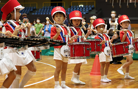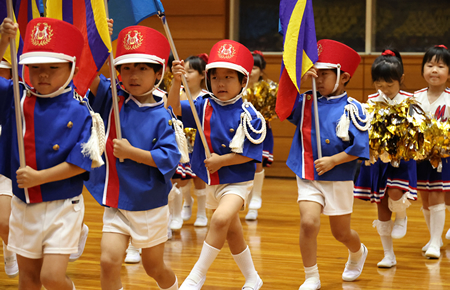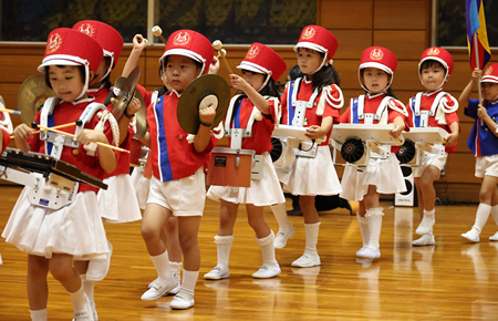 年長組によるマーチングバンドをはじめとして、体操、かけっこ、ダンスなどの種目を観客の皆様の前で発表します。