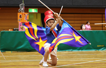 カラフルな旗でお遊戯。